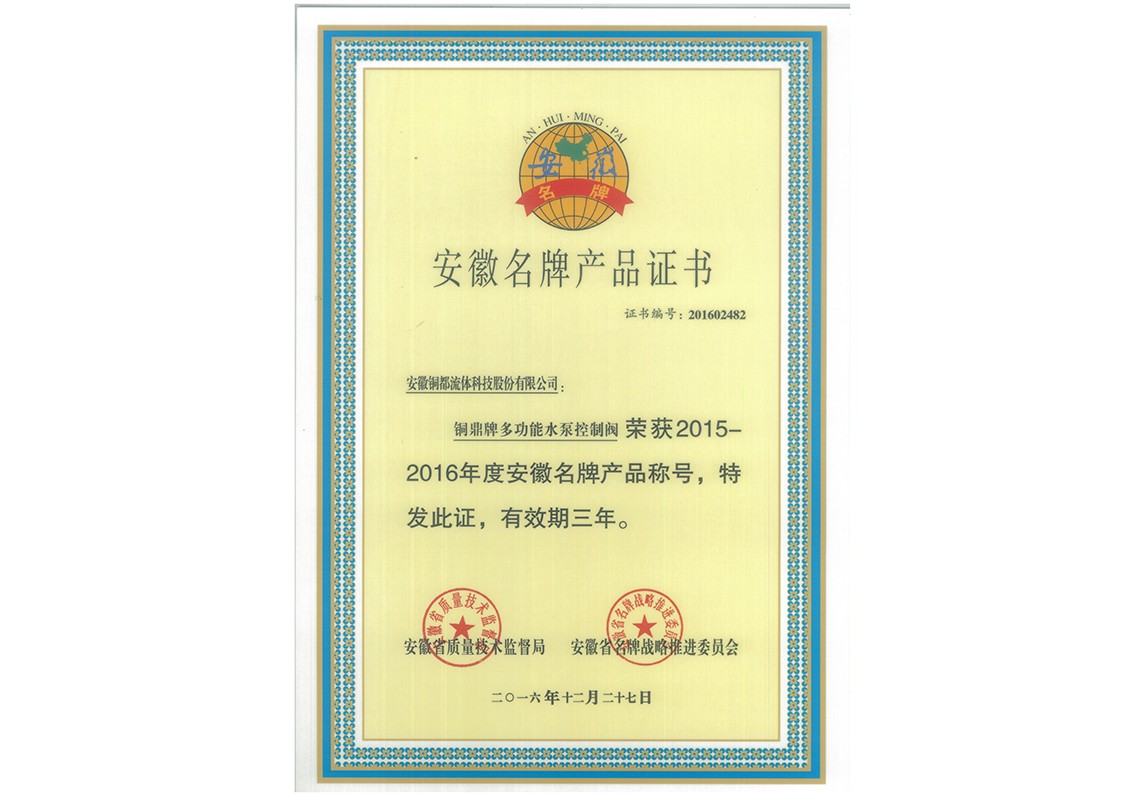 多功能水泵控制閥-名牌產(chǎn)品證書(shū)