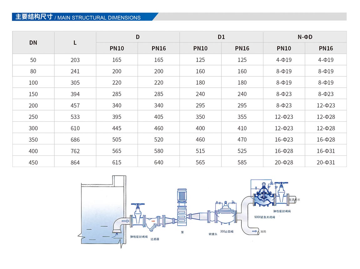900X緊急關(guān)閉閥,是一種用于消防用水與生活用水并聯(lián)的供水系統(tǒng)中,用來調(diào)配供水方向的閥門。當(dāng)火災(zāi)發(fā)生時,消防急需大量用水,900X緊急關(guān)閉閥立即切斷生活用水,確保足夠的消防用水:當(dāng)消防停止用水壓力減小時,閥門自動打開,呈常開狀態(tài),恢復(fù)生活供水。該閥使系統(tǒng)無須另設(shè)專門的消防單獨供水管網(wǎng),大大地節(jié)約了建設(shè)成本和用水量。閥門控制靈敏度高,安全可靠,調(diào)試簡便,使用壽命長。